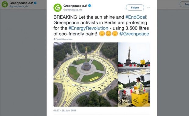 Geht es noch abwegiger? Da kippt Greenpeace in Berlin tausende von Litern gelber Farbe auf die Straße rund um die Siegessäule und verwandelt den Asphalt in eine gefährlich glatte Fläche.