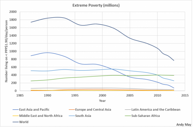 Während über 90% der Menschen im 19. Jahrhundert in extremer Armut lebten, ist diese extreme Armut seitdem in der westlichen Welt vollständig verschwunden und auch in der Dritten Welt rapide und mit sich beschleunigender Rate auf dem Rückzug. Abbildung 2 zeigt die Anzahl der Menschen in verschiedenen ausgewählten Gebieten und der ganzen Welt, die in extremer Armut leben. Die USA, die EU und Kanada sind nicht gezeigt, weil in diesen Ländern niemand in extremer Armut lebt.