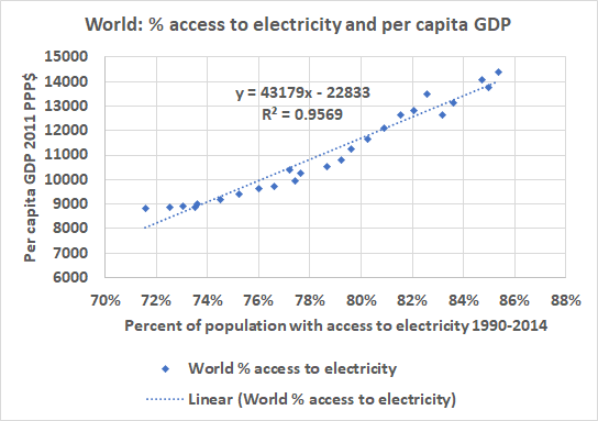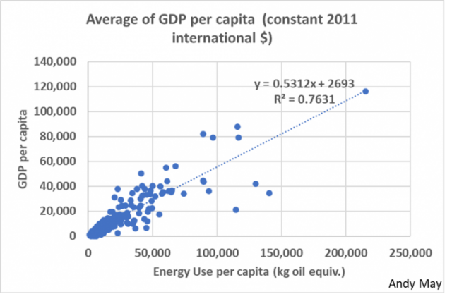 Die Korrelation zwischen Zugang zu Energie, vor allem Strom, und ökonomischen Wohlstand ist sehr stark. Diese starke Korrelation zeigt, beweist aber nicht, dass verfügbare und bezahlbare Energie unabdingbar ist, wenn man die Armut zurückdrängen will. Es zeigt auch, dass wenn man einem Volk den Zugang zu Energie verwehrt die Armut deutlich zunimmt. Andere Faktoren können ebenfalls zu Armut beitragen, etwa Korruption der Regierung, ausufernde Kriminalität und Kriege, aber mit Sicherheit ist der Zugang zu bezahlbarer Energie eine entscheidende Komponente für wirtschaftlichen Erfolg.