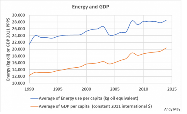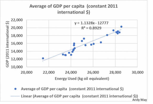 In Abbildung 5 ist der primäre Pro-Kopf-Energieverbrauch aufgetragen im Vergleich mit dem BIP pro Kopf. Die Punktwerte sind die Mittelwerte der jährlichen Gesamtzahlen von 1994 bis 2014. Die Korrelation ist nicht allzu groß, aber akzeptabel, das F der Regression ist signifikant auf dem Niveau 1,4 X 10-67. Dies zeigt, dass die beiden geplotteten Werte sehr eng korrelieren und dass jedes Kilogramm Öl-Äquivalent (Pro-Kopf-Verbrauch) das BIP im Mittel um 53 Cent pro Person wachsen ließ, und zwar im Zeitraum 1990 bis 2011. Ein Barrel Öl enthält 140 kg Öl, welches derzeit etwa 68 Dollar kostet (grob etwa 63,50 Dollar im Jahre 2011) oder 45 Cent pro Kilogramm. Die gleichen Werte kann man in der Zeitdimension von Abbildung 6 betrachten.