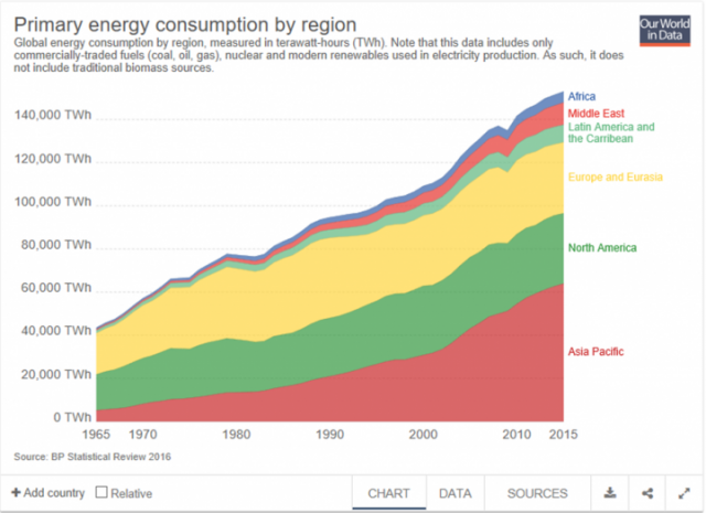 Aus Abbildung 3 geht nicht hervor, dass sich das Niveau extremer Armut verringert hat aufgrund des gesteigerten Verbrauchs fossiler Treibstoffe, aber sie zeigt die starke Relation zwischen beidem und dass der Verbrauch fossiler Treibstoffe der Hauptgrund gewesen sein könnte für die Reduktion der Armut. Energieverbrauch und Armut sind heute ungleich in der Welt verteilt. Abbildung 4 zeigt die globale Verteilung des Gesamt-Energieverbrauchs: