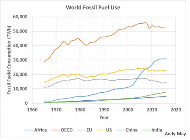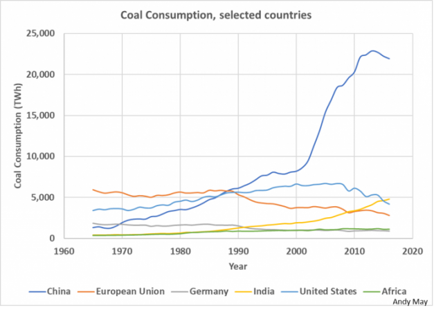Afrika, ein Kontinent mit sehr begrenzter Energie-Infrastruktur, aber bewohnt von über einer Milliarde zumeist armer Menschen, zeigt kaum Veränderungen von Jahr zu Jahr. Indiens Kohleverbrauch steigt und sieht aus wie der in China vor 25 Jahren. Indien verfügt über gewaltige Kohlereserven, den fünftgrößten weltweit, sowie über eine Milliarde Menschen, zumeist sehr arm. Das Land holt ökonomisch sehr schnell auf, und da Zugang zu zuverlässigem Strom für eine vitale Ökonomie lebenswichtig ist, könnte der Verbrauch dem Weg Chinas folgen. Indiens Verpflichtung, CO2-Emissionen und den Kohleverbrauch zu reduzieren, beträgt ein Prozent des BIP (Energieeffizienz). Falls man also dort dem normalen Verlauf der Infrastruktur-Entwicklung folgt wie China, wird man seiner Verpflichtung gerecht, aber die CO2-Emissionen steigen.