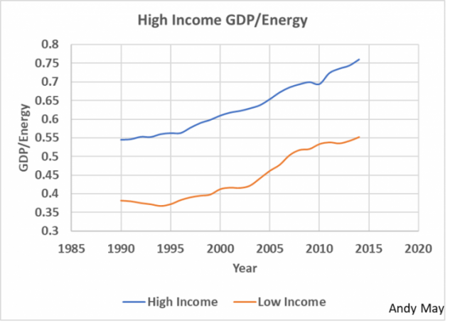 Abbildung 10: Energieeffizienz dargestellt als BIP pro verbrauchte Energie in Ländern mit hohem bzw. niedrigem Einkommen. Datenquellen wie vor.