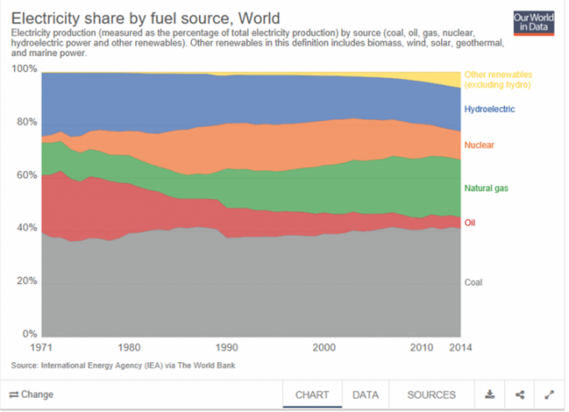 Die Infrastruktur in China ist fast vollendet, und wie man Abbildung 9 entnehmen kann, ist die rapide Zunahme des Verbrauchs fossiler Treibstoffe dort abgeflacht nach der sehr starken Zunahme von 2002 bis 2013. Kohle ist bei Weitem die populärste Energiequelle bei der zuverlässigen Erzeugung von Strom. Kohle deckt nach wie vor immer noch 40% des Welt-Strombedarfs, egal was man aus den blaffenden Nachrichtenmedien hört – siehe Abbildung 11: