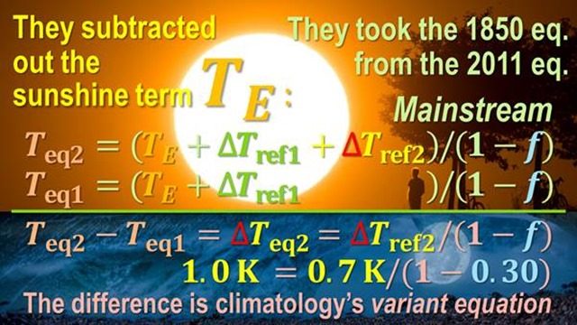 Wie die offizielle Klimatologie die Sonne fälschlich hinaus expedierte und hinsichtlich der globalen Erwärmung falsch lag. Dessen Variante ist die Differenz zwischen zwei Gleichgewichts-Zuständen der vollständigen Mainstream-Gleichung.