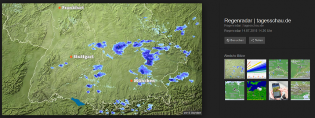 Abb.6, Quelle: Regenradar, tagesschau.de zeigt die Wolkenkarte / Regenkarte vom 14.07. um 14:20, also nachmittags. Nichts im Westen von Gewittern und Regen zusehen und im Süden ist es auch nicht sonnig, sondern sehr regnerisch!