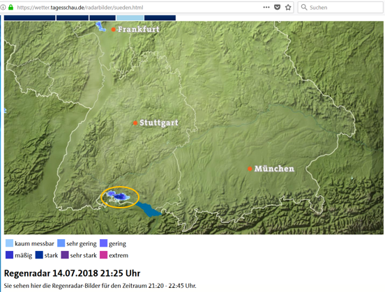 Abb.7, (Quelle: www.wetter.tagesschau.de/radarbilder/sueden) zeigt westlich des Bodensees eine Wolken (Gewitter)-zelle (orangefarbener Kreis) und in der Tat ist diese auch bei Herrn Terli zu finden. Auffällig, dass diese bei Herrn Terli sowohl vormittags als auch nachmittags an ein und derselben Stelle festhängt und darüber hinaus, gut 150 km weiter östlich. Also nur ein Trefferchen. Ungefähr so, als würde der Bundestrainer Toooor schreien, der Ball aber nicht ins gegnerische, sondern ins eigene Tor fliegt. So etwas nennt man dann wohl Eigentor!