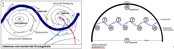 Abb.8: Aufgrund der Erdrotation befinden wir uns in unseren Breiten in einer Westwindzone zwischen Polarluft und subtropischer Luft. Da die Strömung nicht glatt ist, sondern mäandriert, kommt es zu Wellenbergen und Tälern, an denen sich Wirbel bilden – die Hoch- und Tiefdruckgebiete. Die Abbildungen zeigen, dass sich südlich des Jetstream (Jetstreamschlinge) ein Hoch ausbildet und nördlich davon ein Tief. Die jeweilige Stärke des Tiefs oder Hochs ist sowohl abhängig von der Stärke des Jetstreams, als auch von seiner Ausprägung der Mäander. Die rechte Abbildung zeigt den Verlauf der Hoch- und Tiefdruckgebiete entlang des Polarfrontjet auf der Nordhalbkugel (hier). Wegen ihres globalen Auftretens spricht man fachlich von Planetarische Wellen.