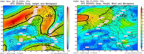 Abb.9, Quelle: Institut für Meteorologie der FU Berlin, zeigen, wie die Winde und damit der Wolkenfluss dem Jetstream folgen. Die Abbildung links zeigt den Jetstream in 300hPa-Höhe (9.164 Meter Höhe) mit den zugehörigen Isobaren. Die Abbildung rechts, den Windverlauf in 850hPa-Höhe (1.457 Meter Höhe). Klar erkennbar, dass die Luftströmungen und damit die Wolken- und Niederschlagsgebiete dem Verlauf des Jetstream folgen.