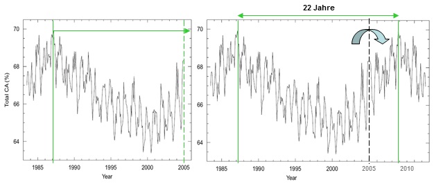 Abb.10 links zeigt die globale Wolkenbedeckung von Juli 1983 – Juni 2005, nach Daten des ISCCP, (http://www.leif.org/research/cloud-cover.png). Die Abbildung stammt aus der Arbeit von Evan et al. “Arguments against a physical long-term trend in global ISCCP cloud Amounts“. Bereits die linke Abbildung zeigt eine periodische Schwingung von größer 18 Jahren (grüner Pfeil). Dass Kurvenminimum liegt im Maximum des 23. Schwabe-Zyklus im Jahr 2000. Rechts ist der Kurvenverlauf an der gestrichelten Linie gespiegelt und ab 2005 angesetzt. Dabei wurde darauf geachtet, dass das Verhältnis zwischen Anstieg und Rückgang im Schwabe-Zyklus etwa 2 zu 3 beträgt (die Anstiegszeit ist nicht exakt fix, sondern davon abhängig, wie stark der kommende Zyklus ist – starker Zyklus = schnelle Anstiegszeit, schwacher Zyklus = langsame Anstiegszeit, insofern stellt das Verhältnis 2 zu 3 einen Mittelwert dar). Das Maximum der globalen Bewölkung hängt in eindeutiger Weise vom Hale-Zyklus (Polaritätszyklus der Sonne) und damit von der Polarität des magnetischen Sonnenzyklusses ab.
