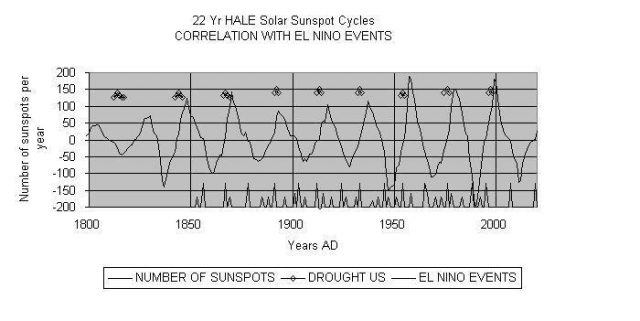 Abb.12 zeigt den Hale-Zyklus (http://nexialinstitute.com/climate_el_nino.htm) von 1800 – 2009 (obere Datenreihe). Die Rauten geben US-Trockenjahre an und die untere Datenreihe zeigt El-Niño-Ereignisse. Die US-Trockenjahre und die damit verbundenen „Feststeckenden Hochs“ sind nach Herrn Terli sicherlich auch direkte Folgen des Klimawandels.