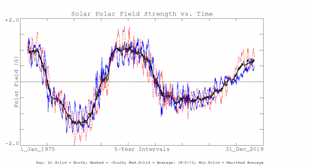 Polarfeld und Hale-Zyklus gehen „Hand in Hand“. Der Hale-Zklus, der 2-mal dem 11-jährigen Schwabe-Zyklus entspricht (dann hat der Schwabe-Zyklus wieder gleiche Polarität) hat seinen Wechsel in 2018, hier. Während das Polarfeld aus den Polen der Sonne kommend (daher der Name) seinen Einfluss auf unser Wetter über die Modulation des irdischen Magnetfeldes, hier insbesondere der Bz-Komponente, ausübt, wirkt der Hale-Zyklus über seine Stärke und Polarität, aber nicht über die Pole, sondern die Äquatorial- bzw. Subäquatorialbereiche der Sonne. In der pdf hat der Autor dies in 2011 auf 150 Seiten detaillierter beschrieben.