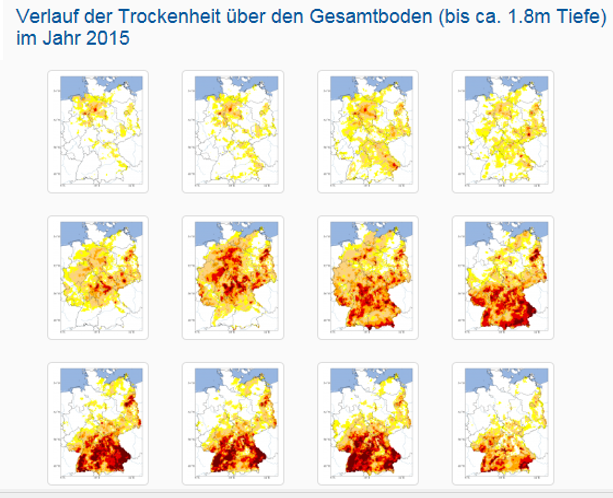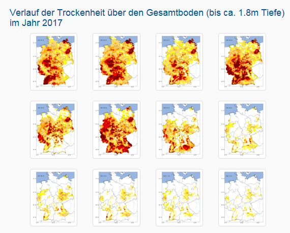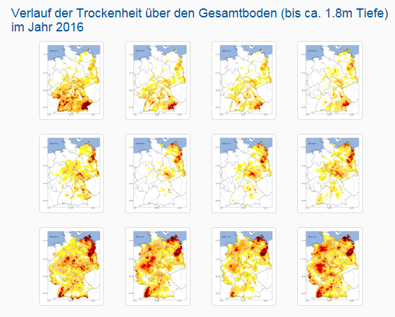 Abb.16: Dürresituation in Deutschland 2016, Quelle wie Abb.14. Man beachte, von September 2016 bis Juli 2017 eine anhaltende, lange Trockenheit.