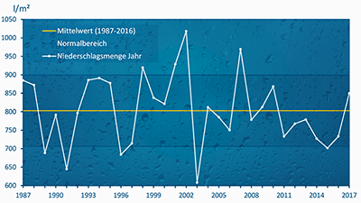 Abb.19, Quelle: (https://www.wetteronline.de/wetterrueckblick/2017-12-31-jr ) zeigt, dass kein Trend beim Niederschlag zu verzeichnen ist. Wetteronline dazu: „Im Vergleich zu seinen Vorgängern zeigte sich das Jahr 2017 deutlich feuchter. Trotzdem bewegte sich die Regenmenge über Deutschland verteilt noch immer im Normalbereich des langjährigen Durchschnitts.“