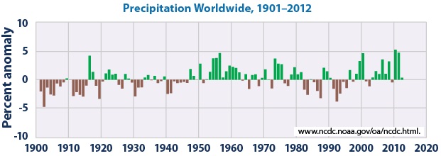 Abb.20: Auch weltweit ist nach den Daten der NOAA und des NCDC keine Trockenheit zu verzeichnen. Mehr noch, die Jahre sind regenreicher geworden. Man vergleiche heute mit der Situation um 1900.