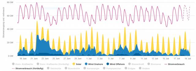 Bild 1 Wind- und Sonnenstromeinspeisung vom 18.06. – 18.07.2018. Quelle: Agora-Viewer