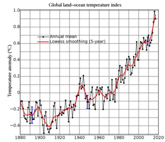 Abbildung 1: Temperaturindex Land ↔ Ozean von 1880 bis heute mit der Referenzperiode 1951 bis 1980. Die durchgezogene schwarze Linie stellt das globale jährliche Mittel dar, und die rote Linie ist eine Fünf-Jahre-Glättung, d. h. eine nicht parametrische Regressions-Analyse auf der Grundlage eines k-nearest-neighbor-Modells [?]. Die Funktion ist evaluiert mittels eines Bruchteils der Daten, die mit einem Zehn-Jahre-Fenster der Daten korrespondieren. Das ergibt eine effektive Glättung über etwa fünf Jahre. Die blauen Unsicherheits-Balken (95% Vertrauenslimit) berücksichtigen nur die unvollständige räumliche Datensammlung. Grundlagen sind die Abbildung 1A in Hansen et al. (2006) und Abbildung 9a in Hansen et al. (2010). Quelle