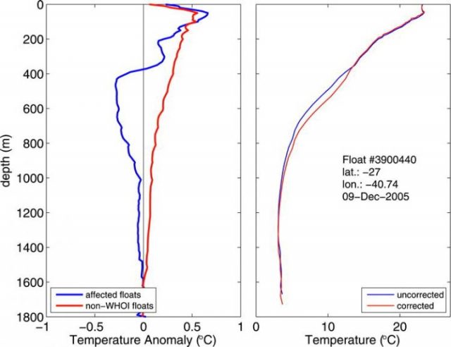 Mittelt man den Fehler in spezifischen Tiefen, erhält man ein Differential von 0,15 Grad in einer Tiefe zwischen etwa 350 und 1100 m. Diese Zahl differiert von dem Kalt-Bias um -0,5°C, wie oben festgestellt, obwohl dieser nur zwischen 400 und 700 m Tiefe definiert war.
