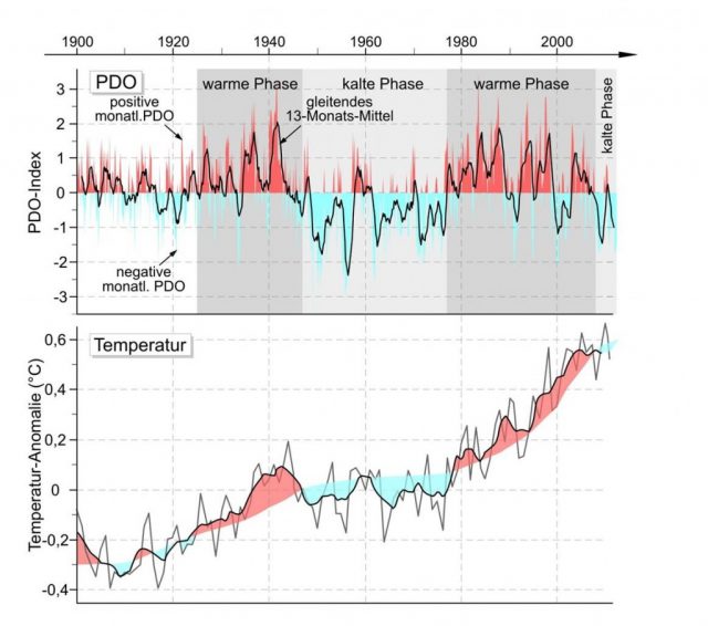 Abb.: Ozeanzyklus PDO und Schwankungen in der globalen Temperaturentwicklung. Quelle: Buch ‘Die kalte Sonne‘.
