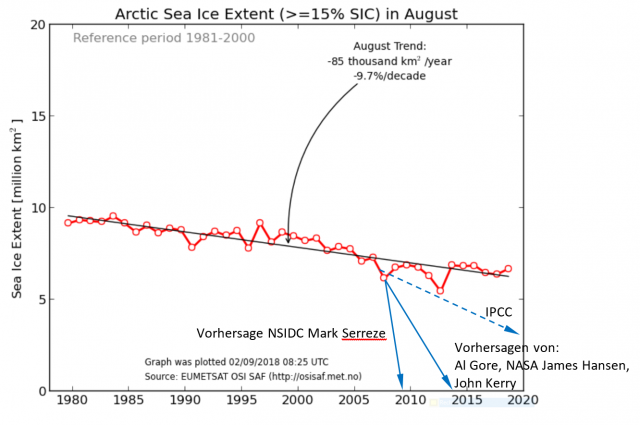 Bild 1 Arktische Eisbedeckung im August seit 1978. Quelle: DMI, abgefragt am 04.09.2018. Vom Autor zugefügt „Vorhersagewerte“ Quelle: NoTricksZone: A false prediction is a false prediction Even 10-year forecasts are total failures – can we trust 50-year forecasts?