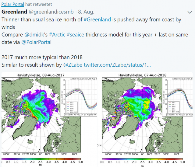 In einem Polarportal ist zudem hinterlegt, wie es am Nordrand von Grönland diesen Sommer aussah und warum sich dort Schelfeis gelöst hatte: Diesen Sommer ist (nur dort) das Meereis dünner (Bild 2, rechter Teil) und es wehte Wind in Meerrichtung. Dafür war allerdings ein größerer Teil der Arktis eisbedeckt.