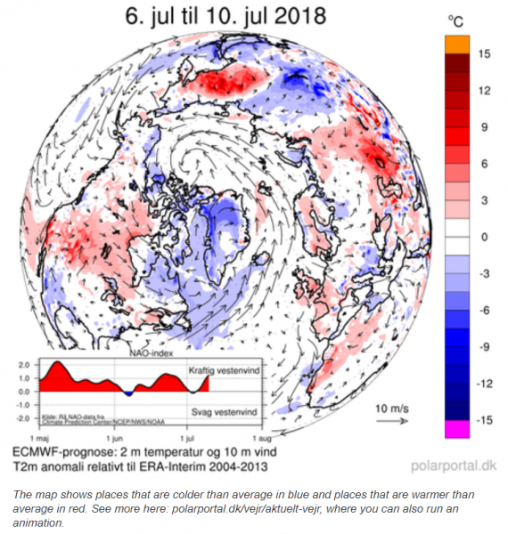 Bild 3 Temperaturanomalien 2018 Anfang Juli der Arktis. Quelle: PolarPortal