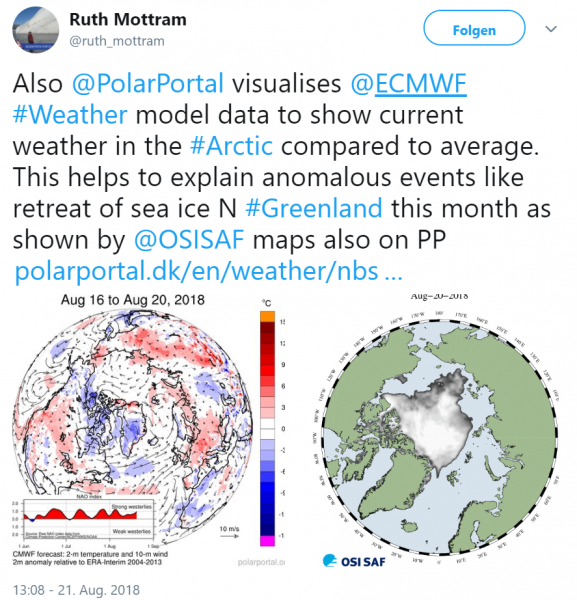 Der Grund ist in den folgenden Bildern sichtbar: Bis zum Juli war es im Nordgrönland herum relativ kalt (Bild 3). Im August wurde es gerade um Nordgrönland warm (Bild 4) und es wehte starker Westwind.