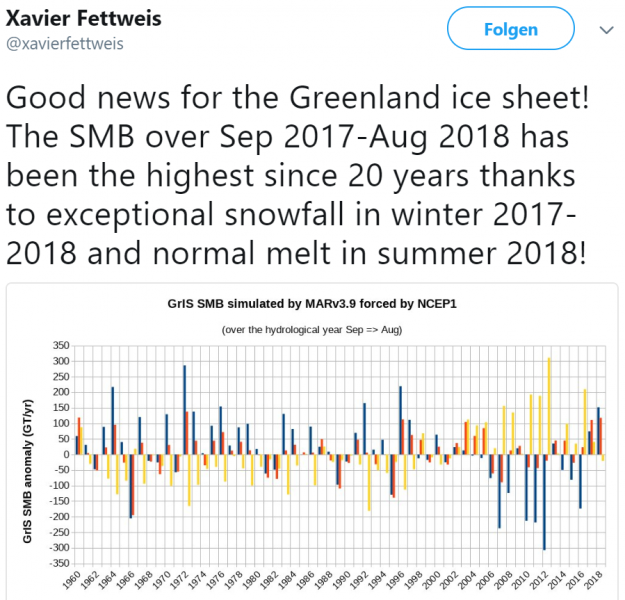 Die SZ hätte anstelle dieses lokal beschränkten Effektes auch auf etwas anderes hinweisen können, wie zum Beispiel, dass die grönländische Festlands-Eismasse sogar zugenommen hat.