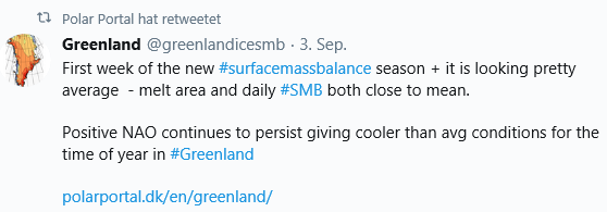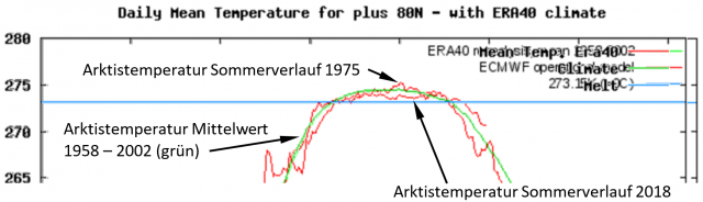 Und dass die Arktis-Sommertemperaturen dieses Jahr deutlich niedriger waren, als im Jahr 1975, dem Zeitraum, als von den Klimawissenschaftlern unisono die beginnende Eiszeit ausgerufen wurde (Spiegel, am 12.08.1974), zeigt das folgende Bild. Trotz der „heißen“ Wintertemperaturen und der Vorhersage von „Klimafachpersonen“: „ ... .. Temperaturanstieg hat fatale Folgen für die Meereisentwicklung … „