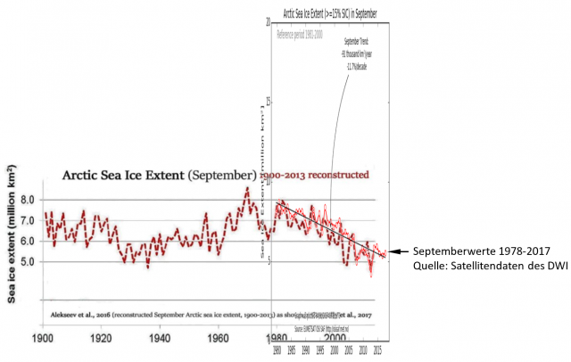 Bild 5 Arktische Meereisausdehnung. Quellen: 1978 … 2017: DMI; 1900 … 2013: NoTricksZone, Alekseev et al, 2016. Grafik durch Übereinander-kopieren vom Autor erstellt