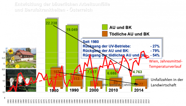 Bild 1 Entwicklung der bäuerlichen Arbeitsunfälle und Berufskrankheiten Österreich. Jahres-Mitteltemperatur Wien vom Autor zugefügt. Quelle Unfalldaten: SVB.at; Temperaturen: wien.gv.at