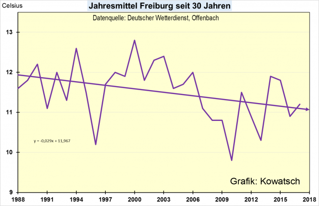 Abb.1 Seit 30 Jahren zeigt die Wetterstation der Stadt Freiburg im warmen Südwesten Deutschlands eine deutliche Abkühlung. Das wärmste Jahr war das Jahr 2000.