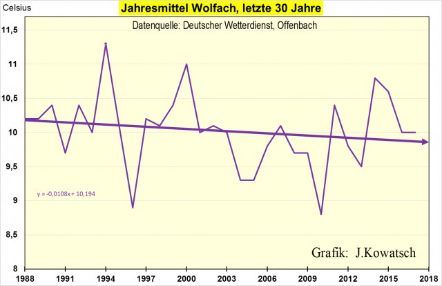 Abb.3. Die DWD-Wetterstation Wolfach in Deutschlands Südwesten zeigt seit 30 Jahren eine leichte Abkühlung. Abkühlung ist das Gegenteil einer Erwärmung. Das wärmste Jahr der letzten 30 Jahre war wie in vielen Orten im Süden mit geringem WI-effekt das Jahr 1994.