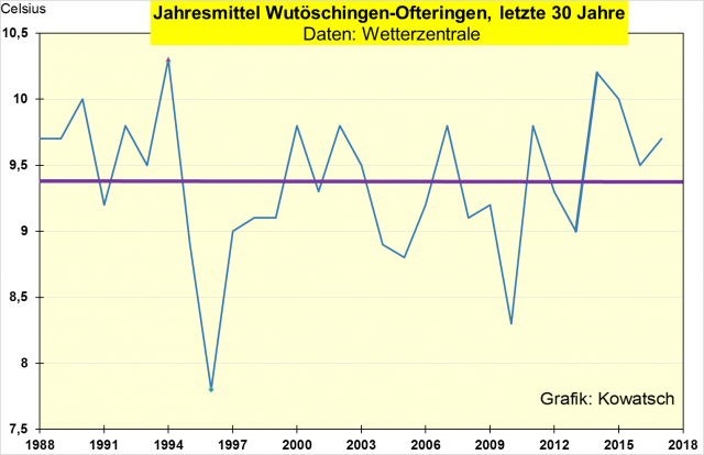 Abb.6: Obwohl die Wetterstation unmittelbar neben einer breiten Straße steht, zeigt Wutöschingen-Ofteringen über die letzten 30 Jahre keine Erwärmung.