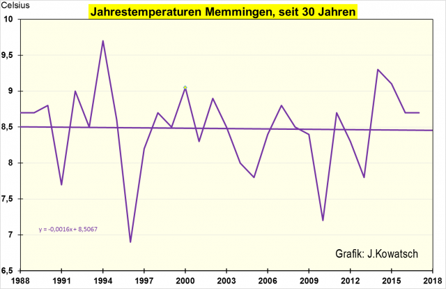 Abb.7: Auch in Memmingen stagniert die Erwärmung seit 30 Jahren. Die Station steht nicht in einer wärmenden Siedlung, sondern im Stadtgarten, der Friedhof schließt sich an
