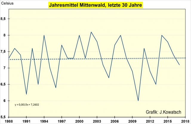 Abb.8: Auch der Wintersportort Mittenwald zeigt seit 30 Jahren keine Klimaerwärmung trotz moderater Bebauung und Zunahme der Touristen, der Wintersportler und des Straßenverkehrs im Ort selbst.