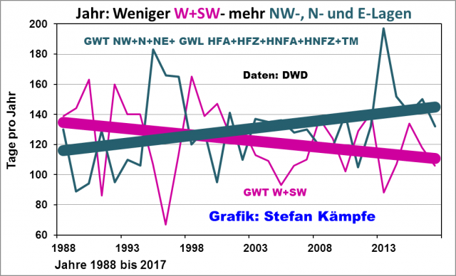 Ein möglicher Abkühlungsgrund mancher Stationen ist die Häufigkeitsentwicklung der Großwetterlagen und die Entwicklung der Sonnenscheindauer in den letzten 30 Jahren. Während bei langfristiger Betrachtung, also über mehr als 50 Jahre, die Häufigkeit der im Jahresmittel besonders erwärmend wirkenden West- und Südwestlagen zu- und die der kühlenden NW-, N-, NE-, Skandinavien-Hoch- und TM-Lagen abnahm, zeigt sich über die vergangenen 30 Jahre ein anderes Bild: