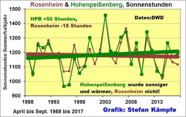 Abb.10: Seit 30 Jahren wird das Sommerhalbjahr am Hohenpeißenberg (grün), der einen starken Erwärmungstrend im Jahresmittel zeigt, sonniger, in Rosenheim nicht.