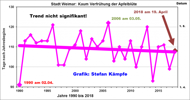 Abbildung 1: Kaum verfrühte Apfelblüte 2018 – Schuld war der kalte Spätwinter. Auch langfristig (seit 1990) verfrühte sich die Apfelblüte nur um etwa 3 Tage.