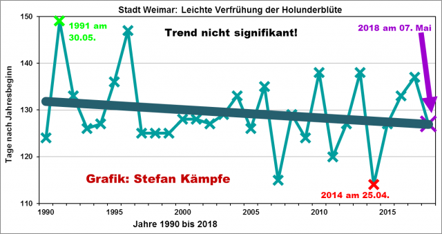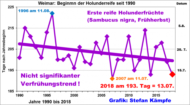 Abbildung 14: Die Holunderreife verfrühte sich langfristig um etwa eine Woche. Aber ihr bislang zeitigster Beginn war nicht 2018, sondern 2007.
