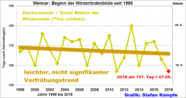 Abbildung 9: Geringe Verfrühung der Winterlinden-Blüte (Beobachtungsdaten leider erst seit 1998 vorliegend). Zusammen mit 2011, war 2018 der zeitigste Blühbeginn.