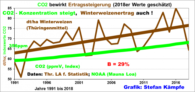 Abbildung 15: Keine gute Winterweizenernte 2018 in Thüringen – doch eine Missernte wäre viel geringer ausgefallen. Langfristig werden die Erträge weiter steigen – Dank besserer Anbaumethoden und Sorten, aber auch, weil der Grundnährstoff CO2 reichhaltiger verfügbar ist.