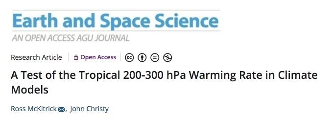 Computer-Klimasimulationen prophezeien, dass eine vom Menschen verursachte globale Erwärmung dazu führen wird, dass sich die Troposphäre über den Tropen viel rascher erwärmen wird als die Oberfläche. Dazu gab es eine Reihe wissenschaftlicher Studien, in denen es darum ging, ob diese Prophezeiung in der Praxis zu beobachten ist. In einem kürzlich geposteten Beitrag beschreibt McKitrick die Hintergründe, einschließlich der Versuche eines Mainstream-Wissenschaftlers, Daten zurückzuhalten, und die nachfolgende Enthüllung, dass dieser Wissenschaftler die Daten auf eine Art und Weise bearbeitet hatte, dass man daraus fundamental andere Folgerungen ableiten musste. McKitrick umriss außerdem eine Reihe nachfolgender Studien, die zu dem Schluss gekommen waren, dass die troposphärische Erwärmung in der realen Welt viel geringer als prophezeit ausgefallen ist: