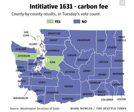 Die Wähler in Washington hatten über eine Maßnahme zu entscheiden, welche von einer großen Koalition linker Gruppen gestützt wurde, nämlich die Besteuerung von Kohlendioxid-Emissionen aus der Verbrennung fossiler Treibstoffe in ihrem Staat. Die Maßnahme mit der Bezeichnung Initiative 1631 ist der dritte Versuch, eine Kohlenstoffsteuer in Washington State einzuführen. Die Wähler hatten einer ähnlichen Maßnahme bereits im Jahre 2016 eine Abfuhr erteilt, und eine Gesetzgebung bzgl. einer Kohlenstoffsteuer ist schon Anfang 2018 gescheitert. – Michael Bastasch, The Daily Caller, 7. November 2018 (paywalled)