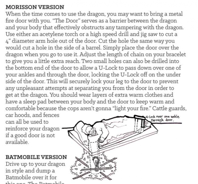 Im „Manual“ werden viele Möglichkeiten beschrieben, Menschen, Maschinen und sonstiges mit Beton und Eisen im Boden fest zu verankern. Oder auch ein Fass mit Zement, in dem von beiden Seiten je eine Person ihren Arm hineinsteckt, innen sind die Arme verkettet.