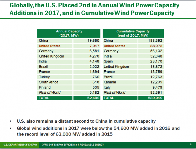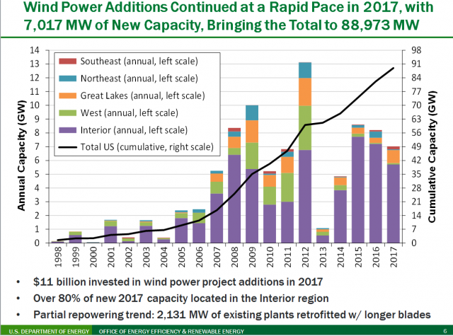 - Im Jahr 2017 auf erreichte die Nennleistung der Windkraftanlagen in USA 7.017 MW, es wurden 11 Milliarden US-Dollar in neue Anlagen investiert. Die Windenergie trug 6,3% zur Stromversorgung des Landes bei, in vierzehn Bundesstaaten mehr als 10% und in vier dieser Staaten mehr als 30% der gesamten Stromerzeugung.