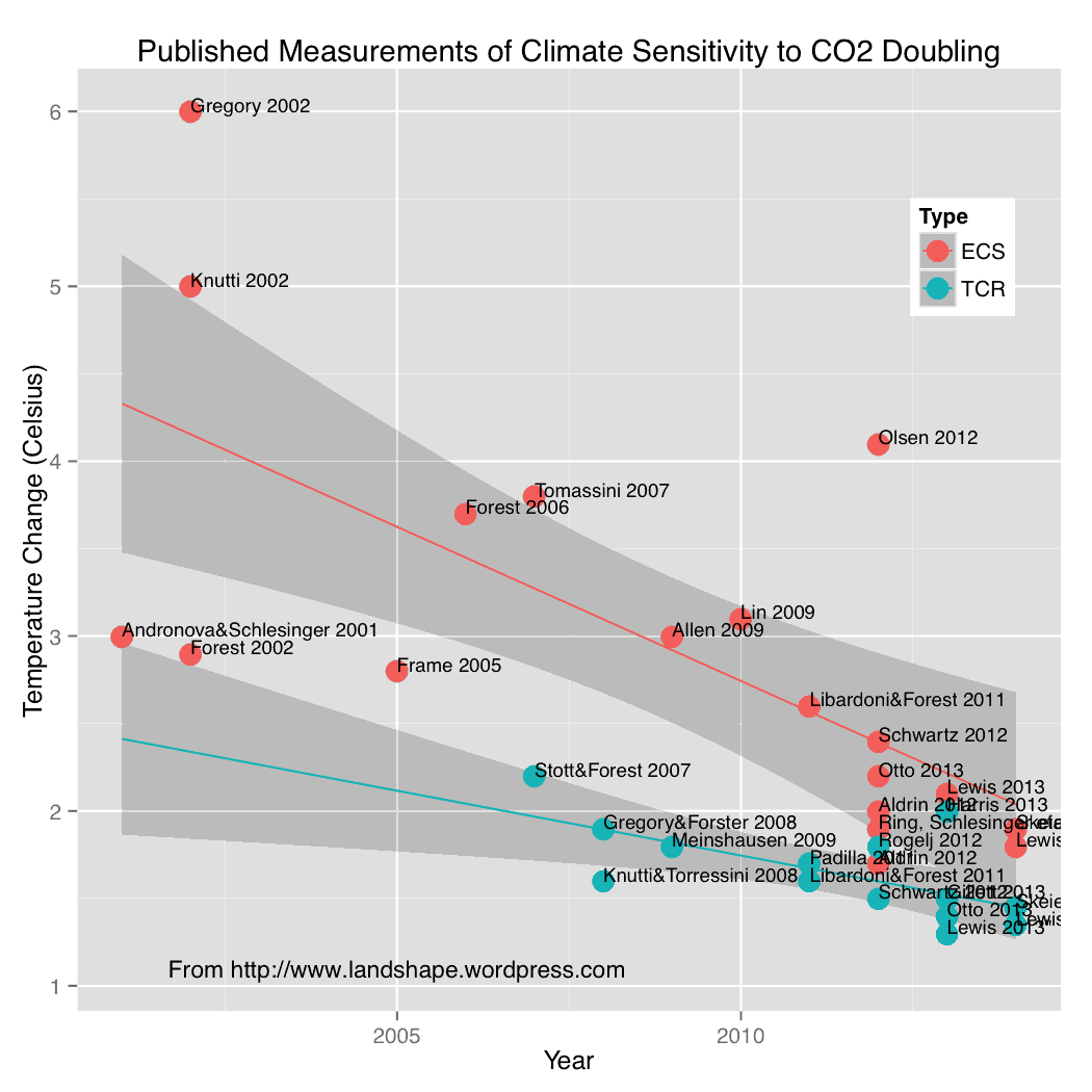 Wenn man berücksichtigt, dass ein Teil des Temperaturanstiegs natürlichen Ursprungs ist, kommt man leicht auf ECS-Werte um oder unterhalb 1 Grad.