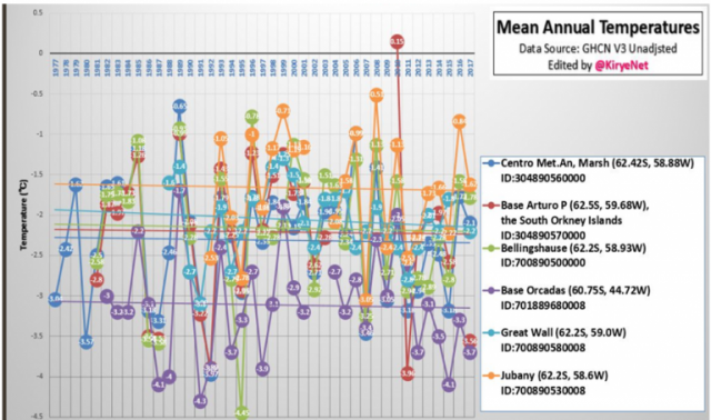 An diesen sechs Stationen auf den Süd-Shetland-Inseln und den Süd-Orkney-Inseln im Antarktischen Ozean wurde seit Jahrzehnten sogar ein leichter Abkühlungstrend registriert.