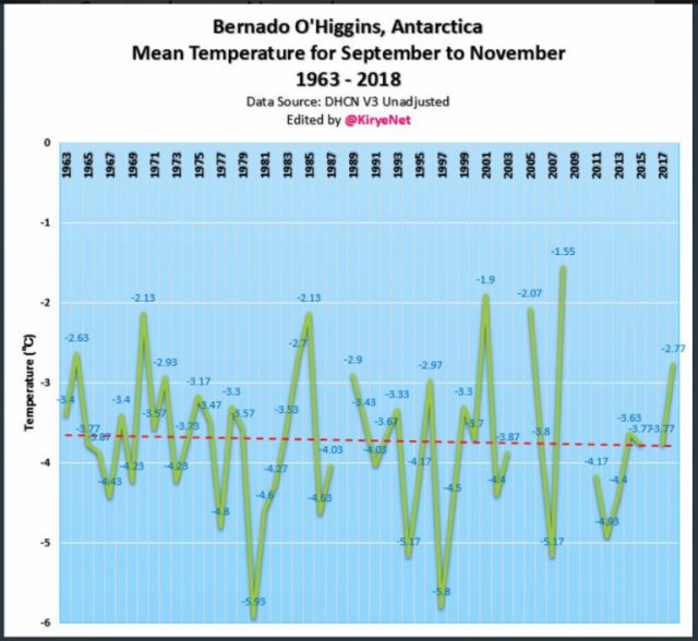 An der Station Bernardo O’Higgins in der Antarktis betrug die mittlere Temperatur von September bis November 2018 -2,77°C. Im gleichen Zeitraum wurde von 1963 bis 2018 kein Erwärmungstrend verzeichnet.