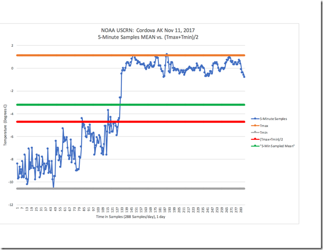 Die blaue Linie repräsentiert die 288 Temperaturmessungen jenes Tages. Sie zeigt 24 Stunden mit Temperaturdaten. Die grüne Linie zeigt die korrekte und genaue tägliche Mitteltemperatur, berechnet aus der Summe aller Messwerte dividiert durch die Anzahl der Messungen. Temperatur ist nicht Wärmeenergie, aber sie wird verwendet als eine Annäherung an dieselbe. In dieser Hinsicht zeigen die grüne Linie (Mitteltemperatur) und die Tageslinie (blaue Linie) genau die gleiche Menge von Wärmeenergie über den Zeitraum von 24 Stunden jenes Tages. Das korrekte Mittel beträgt -3,3°C. Tmax wird repräsentiert durch die orange, Tmin durch die graue Linie. Sie ergeben sich aus dem höchsten bzw. niedrigsten Wert der 288 Messungen über den 24-Stunden-Zeitraum. Das aus (Tmax + Tmin)/2 berechnete Mittel zeigt die rote Linie. (Tmax + Tmin)/2 ergibt einen Mittelwert von -4,7°C, weist also einen Fehler von 1,4°C im Vergleich zum korrekten Mittel auf.